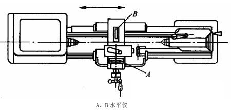 4、當測量長度較大工件時,可將工件平均分若干尺寸段,用分段測量法,然后根據各段的測量讀數,繪出誤差坐標圖,以確定其誤差的大格數。如圖2所示。床身導軌在縱向垂直平面內直線度的檢驗時,將方框水平儀縱向放置在刀架上靠近前導軌處(圖2中位置A),從刀架處于主軸箱一端的位置開始,從左向右移動刀架,每次移動距離應近似等于水平儀的邊框尺(200mm)。依次記錄刀架在每一測量長度位置時的水平儀讀數。將這些讀數依次排列,用適當的比例畫出導軌在垂直平面內的直線度誤差曲線。水平儀讀數為縱坐標,刀架在起始位置時的水平儀讀數為起點,由坐標原點起作一折線段,其后每次讀數都以前折線段的終點為起點,畫出應折線段,各折線段組成的曲線,即為導軌在垂直平面內直線度曲線。曲線相對其兩端連線的大坐標值,是導軌全長的直線度誤差,曲線上任一局部測量長度內的兩端點相對曲線兩端點的連線坐標差值,也是導軌的局部誤差。